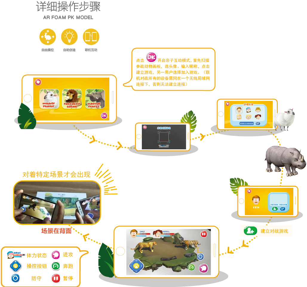联机互动让制作出来的动物上场PK, 简单的对抗模式让家长和宝宝在亲子对战中建立获得更多的乐趣。